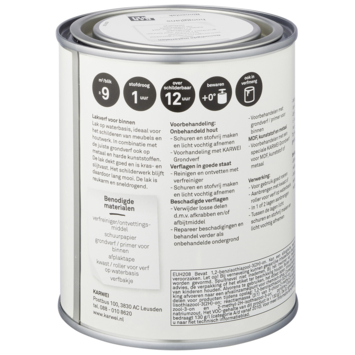 Karwei extra dekkende binnenlak hoogglans zorgt voor een professionele afwerking van jouw interieur. Met een groot kleurbehoud geven ze jouw deuren, kozijnen en meubels langdurig een warme uitstraling. De lakken op waterbasis zijn sneldrogend en reuk- en oplosmiddelarm en daarmee optimaal voor binnengebruik. De stoot- en krasvaste eigenschappen zorgen voor een duurzame afwerking van de gelakte ondergrond.