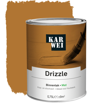 De KARWEI binnenlak mat drizzle 750 ml is een watergedragen verf die ideaal is voor binnenshuis. De lak is kras- en stootvast, waardoor je deuren, kozijnen en meubels goed kunt beschermen tegen slijtage. Omdat de verf op waterbasis is, is hij geurarm en blijft hij langer mooi van kleur. Je kunt de lak op hout gebruiken en met de juiste grondverf ook op metaal en kunststof. De verf is stofdroog na 1 uur en je kunt de volgende laag aanbrengen na 12 uur.