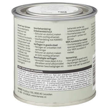 Karwei extra dekkende binnenlak mat zorgt voor een professionele afwerking van jouw interieur. Met een groot kleurbehoud geven ze jouw deuren, kozijnen en meubels langdurig een warme uitstraling. De lakken op waterbasis zijn sneldrogend en reuk- en oplosmiddelarm en daarmee optimaal voor binnengebruik. De stoot- en krasvaste eigenschappen zorgen voor een duurzame afwerking van de gelakte ondergrond.