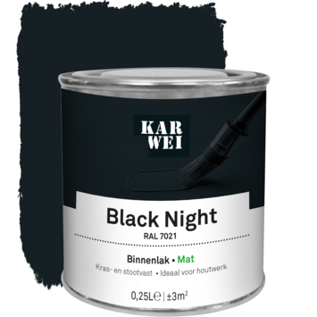 De KARWEI binnenlak mat RAL 7021 black night 250 ml is een watergedragen verf die ideaal is voor binnenshuis. De lak is kras- en stootvast, waardoor je deuren, kozijnen en meubels goed kunt beschermen tegen slijtage. Omdat de verf op waterbasis is, is hij geurarm en blijft hij langer mooi van kleur. Je kunt de lak op hout gebruiken en met de juiste grondverf ook op metaal en kunststof. De verf is stofdroog na 1 uur en je kunt de volgende laag aanbrengen na 12 uur.