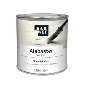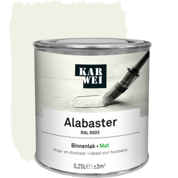 De KARWEI binnenlak mat RAL 9003 alabaster 250 ml is een watergedragen verf die ideaal is voor binnenshuis. De lak is kras- en stootvast, waardoor je deuren, kozijnen en meubels goed kunt beschermen tegen slijtage. Omdat de verf op waterbasis is, is hij geurarm en blijft hij langer mooi van kleur. Je kunt de lak op hout gebruiken en met de juiste grondverf ook op metaal en kunststof. De verf is stofdroog na 1 uur en je kunt de volgende laag aanbrengen na 12 uur.