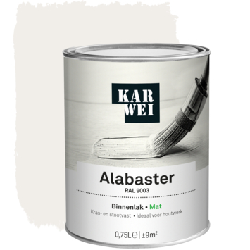 De KARWEI binnenlak mat RAL 9003 alabaster 750 ml is een watergedragen verf die ideaal is voor binnenshuis. De lak is kras- en stootvast, waardoor je deuren, kozijnen en meubels goed kunt beschermen tegen slijtage. Omdat de verf op waterbasis is, is hij geurarm en blijft hij langer mooi van kleur. Je kunt de lak op hout gebruiken en met de juiste grondverf ook op metaal en kunststof. De verf is stofdroog na 1 uur en je kunt de volgende laag aanbrengen na 12 uur.
