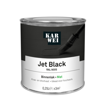De KARWEI binnenlak mat RAL 9005 jet black 250 ml is een watergedragen verf die ideaal is voor binnenshuis. De lak is kras- en stootvast, waardoor je deuren, kozijnen en meubels goed kunt beschermen tegen slijtage. Omdat de verf op waterbasis is, is hij geurarm en blijft hij langer mooi van kleur. Je kunt de lak op hout gebruiken en met de juiste grondverf ook op metaal en kunststof. De verf is stofdroog na 1 uur en je kunt de volgende laag aanbrengen na 12 uur.