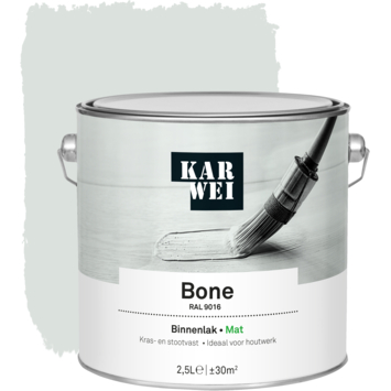 De KARWEI binnenlak mat RAL 9016 bone 2,5 liter is een watergedragen verf die ideaal is voor binnenshuis. De lak is kras- en stootvast, waardoor je deuren, kozijnen en meubels goed kunt beschermen tegen slijtage. Omdat de verf op waterbasis is, is hij geurarm en blijft hij langer mooi van kleur. Je kunt de lak op hout gebruiken en met de juiste grondverf ook op metaal en kunststof. De verf is stofdroog na 1 uur en je kunt de volgende laag aanbrengen na 12 uur.