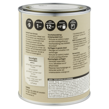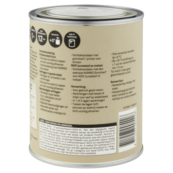 Karwei extra dekkende binnenlak mat zorgt voor een professionele afwerking van jouw interieur. Met een groot kleurbehoud geven ze jouw deuren, kozijnen en meubels langdurig een warme uitstraling. De lakken op waterbasis zijn sneldrogend en reuk- en oplosmiddelarm en daarmee optimaal voor binnengebruik. De stoot- en krasvaste eigenschappen zorgen voor een duurzame afwerking van de gelakte ondergrond.