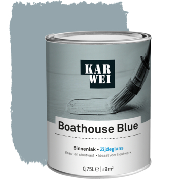 De KARWEI binnenlak zijdeglans boathouse blue 750 ml is een watergedragen verf die ideaal is voor binnenshuis. De lak is kras- en stootvast, waardoor je deuren, kozijnen en meubels goed kunt beschermen tegen slijtage. Omdat de verf op waterbasis is, is hij geurarm en blijft hij langer mooi van kleur. Je kunt de lak op hout gebruiken en met de juiste grondverf ook op metaal en kunststof. De verf is stofdroog na 1 uur en je kunt de volgende laag aanbrengen na 12 uur.