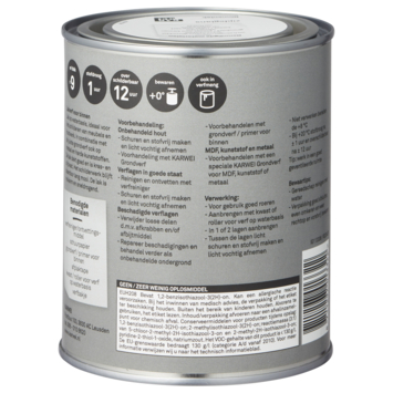 Karwei extra dekkende binnenlak zijdeglans zorgt voor een professionele afwerking van jouw interieur. Met een groot kleurbehoud geven ze jouw deuren, kozijnen en meubels langdurig een warme uitstraling. De lakken op waterbasis zijn sneldrogend en reuk- en oplosmiddelarm en daarmee optimaal voor binnengebruik. De stoot- en krasvaste eigenschappen zorgen voor een duurzame afwerking van de gelakte ondergrond.