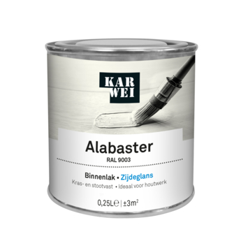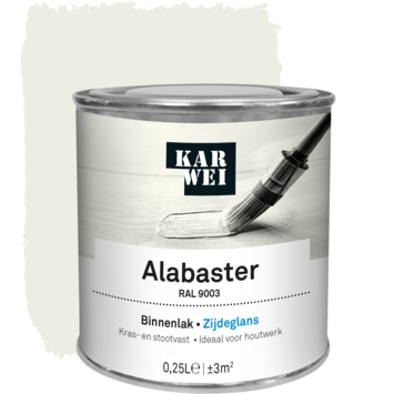 De KARWEI binnenlak zijdeglans RAL 9003 alabaster 250 ml is een watergedragen verf die ideaal is voor binnenshuis. De lak is kras- en stootvast, waardoor je deuren, kozijnen en meubels goed kunt beschermen tegen slijtage. Omdat de verf op waterbasis is, is hij geurarm en blijft hij langer mooi van kleur. Je kunt de lak op hout gebruiken en met de juiste grondverf ook op metaal en kunststof. De verf is stofdroog na 1 uur en je kunt de volgende laag aanbrengen na 12 uur.