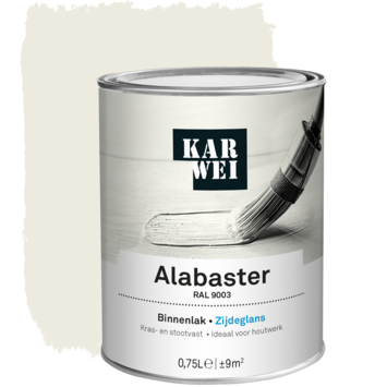 De KARWEI binnenlak zijdeglans RAL 9003 alabaster 750 ml is een watergedragen verf die ideaal is voor binnenshuis. De lak is kras- en stootvast, waardoor je deuren, kozijnen en meubels goed kunt beschermen tegen slijtage. Omdat de verf op waterbasis is, is hij geurarm en blijft hij langer mooi van kleur. Je kunt de lak op hout gebruiken en met de juiste grondverf ook op metaal en kunststof. De verf is stofdroog na 1 uur en je kunt de volgende laag aanbrengen na 12 uur.