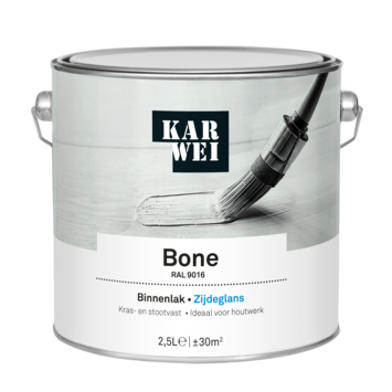 De KARWEI binnenlak zijdeglans RAL 9016 bone 2,5 liter is een watergedragen verf die ideaal is voor binnenshuis. De lak is kras- en stootvast, waardoor je deuren, kozijnen en meubels goed kunt beschermen tegen slijtage. Omdat de verf op waterbasis is, is hij geurarm en blijft hij langer mooi van kleur. Je kunt de lak op hout gebruiken en met de juiste grondverf ook op metaal en kunststof. De verf is stofdroog na 1 uur en je kunt de volgende laag aanbrengen na 12 uur.