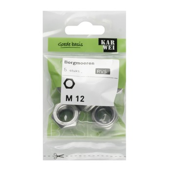 RVS borgmoer. De moer zal niet los trillen door de kunststof ring in de moer.