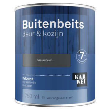 KARWEI buitenbeits deur & kozijn is een duurzame, glanzende, dekkende beits op terpentinebasis. Voor een duurzame bescherming tot 7 jaar van deuren, kozijnen, gevelbetimmering en daklijsten. KARWEI Buitenbeits dekkend dringt goed in het hout, is vochtregulerend en waterafstotend. Lang glansbehoud dankzij het UV filter. Dekkende buitenbeits dekt de houtnerf af, maar blijft wel vochtregulerend. Voorbehandelen met grondverf is niet nodig.