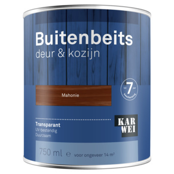 KARWEI buitenbeits deur & kozijn mahonie 750 ml is een transparante beits met UV-filter op terpentinebasis. Voor een bescherming tot 7 jaar van deuren, kozijnen, gevelbetimmering en daklijsten. KARWEI Buitenbeits transparant dringt goed in het