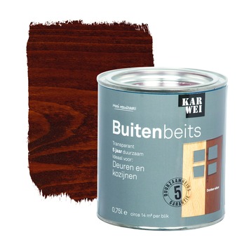 De KARWEI buitenbeits deuren en kozijnen donker eiken transparant 750 ml is ideaal voor het langdurig beschermen van hoogwaardig hout. Door de toevoeging van siliconen en het sterke UV filter kan een duurzaamheid van 5 jaar worden gegarandeerd. Hierdoor is de beits uitermate geschikt voor buitendeuren en buitenkozijnen. Deze glanzende beits is een oplosmiddel houdend product en is weersbestendig, waterafstotend, UV-bestendig en vochtregulerend. Daarnaast heeft de beits een optimale dekking en vloeiing, waardoor het aanbrengen een fluitje van een cent is. Grondverf is niet nodig en je kunt de beits eenvoudig met een kwast of roller aanbrengen. Het blik bevat 750 milliliter transparante beits in donker eiken kleur. Het blik is goed voor het beitsen van zo'n 14 vierkante meter. Op onbehandeld hout is het aan te bevelen om 3 lagen aan te brengen, op hout in goede staat volstaan 2 lagen.