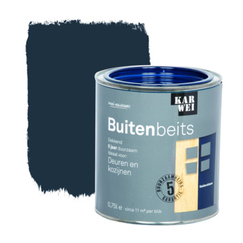 De KARWEI buitenbeits deuren en kozijnen geldersblauw dekkend 750 ml is ideaal voor het langdurig beschermen van hoogwaardig hout. Door de toevoeging van siliconen en het sterke UV filter kan een duurzaamheid van 5 jaar worden gegarandeerd. Hierdoor is de beits uitermate geschikt voor buitendeuren en buitenkozijnen. Deze glanzende beits is een oplosmiddel houdend product en is weersbestendig, waterafstotend, UV-bestendig en vochtregulerend. Daarnaast heeft de beits een optimale dekking en vloeiing, waardoor het aanbrengen een fluitje van een cent is. Grondverf is niet nodig en je kunt de beits eenvoudig met een kwast of roller aanbrengen. Het blik bevat 750 milliliter dekkende beits in de kleur geldersblauw. Het blik is goed voor het beitsen van zo'n 11 vierkante meter. Op onbehandeld hout is het aan te bevelen om 3 lagen aan te brengen, op hout in goede staat volstaan 2 lagen.