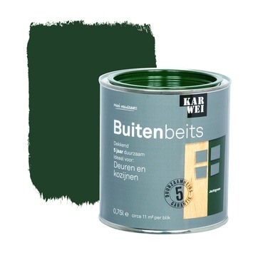 De KARWEI buitenbeits deuren en kozijnen jachtgroen dekkend 750 ml is ideaal voor het langdurig beschermen van hoogwaardig hout. Door de toevoeging van siliconen en een sterk UV filter kan een duurzaamheid van 5 jaar worden gegarandeerd. Hierdoor is de beits uitermate geschikt voor buitendeuren en buitenkozijnen. Deze glanzende beits is een oplosmiddel houdend product en is weersbestendig, waterafstotend, UV-bestendig en vochtregulerend. Daarnaast heeft de beits een optimale dekking en vloeiing, waardoor het aanbrengen een fluitje van een cent is. Grondverf is niet nodig en je kunt de beits eenvoudig met een kwast of roller aanbrengen. Het blik bevat 750 milliliter dekkende beits in de kleur jachtgroen. Het blik is goed voor het beitsen van zo'n 11 vierkante meter. Op onbehandeld hout is het aan te bevelen om 3 lagen aan te brengen, op hout in goede staat volstaan 2 lagen.