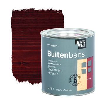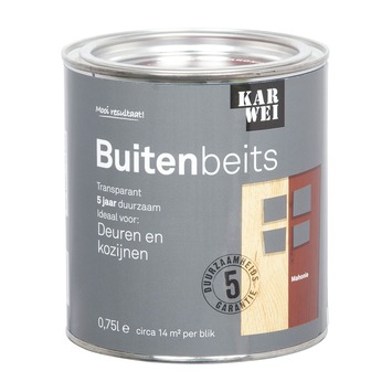 De KARWEI buitenbeits deuren en kozijnen mahonie transparant 750 ml is ideaal voor het langdurig beschermen van hoogwaardig hout. Door de toevoeging van siliconen en het sterke UV filter kan een duurzaamheid van 5 jaar worden gegarandeerd. Hierdoor is de beits uitermate geschikt voor buitendeuren en buitenkozijnen. Deze glanzende beits is een oplosmiddel houdend product en is weersbestendig, waterafstotend, UV-bestendig en vochtregulerend. Daarnaast heeft de beits een optimale dekking en vloeiing, waardoor het aanbrengen een fluitje van een cent is. Grondverf is niet nodig en je kunt de beits eenvoudig met een kwast of roller aanbrengen. Het blik bevat 750 milliliter transparante beits in mahonie kleur. Het blik is goed voor het beitsen van zo'n 14 vierkante meter. Op onbehandeld hout is het aan te bevelen om 3 lagen aan te brengen, op hout in goede staat volstaan 2 lagen.