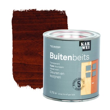 De KARWEI buitenbeits deuren en kozijnen teak transparant 750 ml is ideaal voor het langdurig beschermen van hoogwaardig hout. Door de toevoeging van siliconen en het sterke UV filter kan een duurzaamheid van 5 jaar worden gegarandeerd. Hierdoor is de beits uitermate geschikt voor buitendeuren en buitenkozijnen. Deze glanzende beits is een oplosmiddel houdend product en is weersbestendig, waterafstotend, UV-bestendig en vochtregulerend. Daarnaast heeft de beits een optimale dekking en vloeiing, waardoor het aanbrengen een fluitje van een cent is. Grondverf is niet nodig en je kunt de beits eenvoudig met een kwast of roller aanbrengen. Het blik bevat 750 milliliter transparante beits in teak kleur. Het blik is goed voor het beitsen van zo'n 14 vierkante meter. Op onbehandeld hout is het aan te bevelen om 3 lagen aan te brengen, op hout in goede staat volstaan 2 lagen.