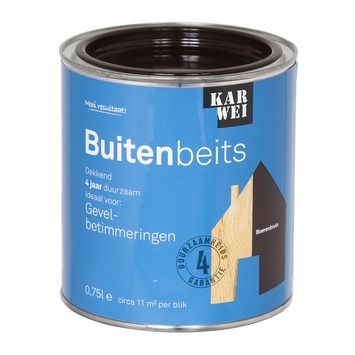De KARWEI buitenbeits gevelbetimmeringen boerenbruin dekkend 750 ml is ideaal voor het langdurig bescherming van hoogwaardig hout zoals daklijsten en gevelbetimmeringen. De lak is weersbestendig, waterafstotend, UV-bestendig en vochtregulerend. Door al deze eigenschappen kan een duurzaamheid van 4 jaar worden gegarandeerd. De beits is een oplosmiddel houdend product en kan eenvoudig worden aangebracht met een kwast of roller. Daarnaast heeft de beits een optimale dekking en vloeiing, waardoor het aanbrengen een fluitje van een cent is. Het blik bevat 750 milliliter boerenbruine beits, dit is genoeg voor een oppervlakte van zo'n 11 vierkante meter. Op onbehandeld hout is het aan te bevelen om 3 lagen aan te brengen, op hout in goede staat volstaan 2 lagen. Grondverf is niet nodig. De buitenbeits gevelbetimmeringen is verkrijgbaar in vele populaire kleuren.