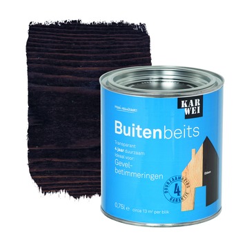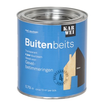 De KARWEI buitenbeits gevelbetimmeringen ebben transparant 750 ml is ideaal voor het langdurig bescherming van hoogwaardig hout zoals daklijsten en gevelbetimmeringen. De lak is weersbestendig, waterafstotend, UV-bestendig en vochtregulerend. Door al deze eigenschappen kan een duurzaamheid van 4 jaar worden gegarandeerd. De beits is een oplosmiddel houdend product en kan eenvoudig worden aangebracht met een kwast of roller. Daarnaast heeft de beits een optimale dekking en vloeiing, waardoor het aanbrengen een fluitje van een cent is. Het blik bevat 750 milliliter transparante ebben beits, dit is genoeg voor een oppervlakte van zo'n 13 vierkante meter. Op onbehandeld hout is het aan te bevelen om 3 lagen aan te brengen, op hout in goede staat volstaan 2 lagen. Grondverf is niet nodig. De buitenbeits gevelbetimmeringen is verkrijgbaar in vele populaire kleuren.