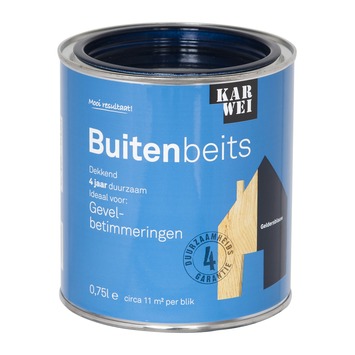 De KARWEI buitenbeits gevelbetimmeringen geldersblauw dekkend 750 ml is ideaal voor het langdurig bescherming van hoogwaardig hout zoals daklijsten en gevelbetimmeringen. De lak is weersbestendig, waterafstotend, UV-bestendig en vochtregulerend. Door al deze eigenschappen kan een duurzaamheid van 4 jaar worden gegarandeerd. De beits is een oplosmiddel houdend product en kan eenvoudig worden aangebracht met een kwast of roller. Daarnaast heeft de beits een optimale dekking en vloeiing, waardoor het aanbrengen een fluitje van een cent is. Het blik bevat 750 milliliter geldersblauwe beits, dit is genoeg voor een oppervlakte van zo'n 11 vierkante meter. Op onbehandeld hout is het aan te bevelen om 3 lagen aan te brengen, op hout in goede staat volstaan 2 lagen. Grondverf is niet nodig. De buitenbeits gevelbetimmeringen is verkrijgbaar in vele populaire kleuren.