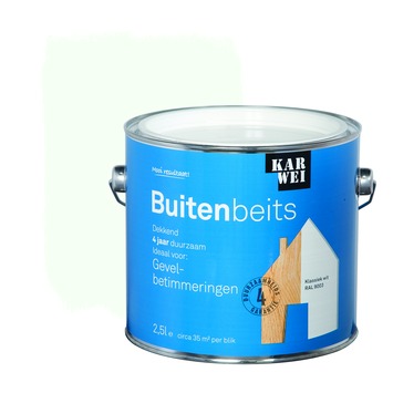 De KARWEI buitenbeits gevelbetimmeringen klassiek wit (RAL 9003) dekkend 2,5 l is ideaal voor het langdurig bescherming van hoogwaardig hout zoals daklijsten en gevelbetimmeringen. De lak is weersbestendig, waterafstotend, UV-bestendig en vochtregulerend. Door al deze eigenschappen kan een duurzaamheid van 4 jaar worden gegarandeerd. De beits is een oplosmiddel houdend product en kan eenvoudig worden aangebracht met een kwast of roller. Daarnaast heeft de beits een optimale dekking en vloeiing, waardoor het aanbrengen een fluitje van een cent is. Het blik bevat 2,5 liter klassiek witte beits, dit is genoeg voor een oppervlakte van zo'n 35 vierkante meter. Op onbehandeld hout is het aan te bevelen om 3 lagen aan te brengen, op hout in goede staat volstaan 2 lagen. Grondverf is niet nodig. De buitenbeits gevelbetimmeringen is verkrijgbaar in vele populaire kleuren.