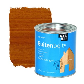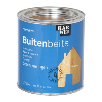 De KARWEI buitenbeits gevelbetimmeringen licht eiken transparant 750 ml is ideaal voor het langdurig bescherming van hoogwaardig hout zoals daklijsten en gevelbetimmeringen. De lak is weersbestendig, waterafstotend, UV-bestendig en vochtregulerend. Door al deze eigenschappen kan een duurzaamheid van 4 jaar worden gegarandeerd. De beits is een oplosmiddel houdend product en kan eenvoudig worden aangebracht met een kwast of roller. Daarnaast heeft de beits een optimale dekking en vloeiing, waardoor het aanbrengen een fluitje van een cent is. Het blik bevat 750 milliliter transparante licht eiken beits, dit is genoeg voor een oppervlakte van zo'n 13 vierkante meter. Op onbehandeld hout is het aan te bevelen om 3 lagen aan te brengen, op hout in goede staat volstaan 2 lagen. Grondverf is niet nodig. De buitenbeits gevelbetimmeringen is verkrijgbaar in vele populaire kleuren.