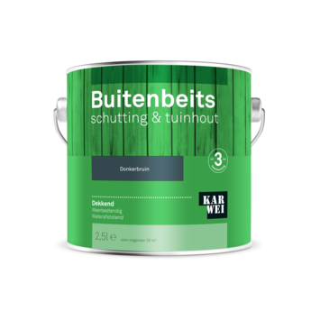 KARWEI buitenbeits schutting & tuinhout is een dekkende, glanzende beits op terpentinebasis. Voor bescherming tot 3 jaar van schuttingen, speeltoestellen en tuinhout. KARWEI buitenbeits dekkend dringt goed in het hout, beschermt tegen weersinvloeden zoals regen en zon, is vochtregulerend en maakt het hout waterafstotend. Ook zeer geschikt voor geïmpregneerd hout. Dekkende buitenbeits dekt de houtnerf af, maar blijft wel vochtregulerend. Voorbehandelen met grondverf is niet nodig.