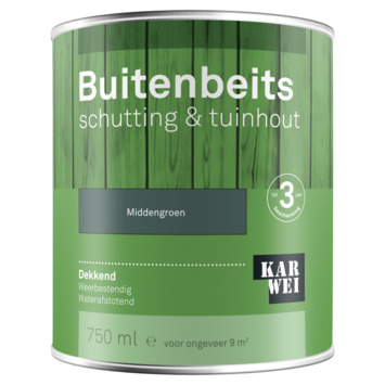 KARWEI buitenbeits schutting & tuinhout is een dekkende, glanzende beits op terpentinebasis. Voor bescherming tot 3 jaar van schuttingen, speeltoestellen en tuinhout. KARWEI buitenbeits dekkend dringt goed in het hout, beschermt tegen weersinvloeden zoals regen en zon, is vochtregulerend en maakt het hout waterafstotend. Ook zeer geschikt voor geïmpregneerd hout. Dekkende buitenbeits dekt de houtnerf af, maar blijft wel vochtregulerend. Voorbehandelen met grondverf is niet nodig.