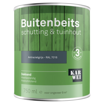 KARWEI buitenbeits schutting & tuinhout is een dekkende, glanzende beits op terpentinebasis. Voor bescherming tot 3 jaar van schuttingen, speeltoestellen en tuinhout. KARWEI buitenbeits dekkend dringt goed in het hout, beschermt tegen weersinvloeden zoals regen en zon, is vochtregulerend en maakt het hout waterafstotend. Ook zeer geschikt voor geïmpregneerd hout. Dekkende buitenbeits dekt de houtnerf af, maar blijft wel vochtregulerend. Voorbehandelen met grondverf is niet nodig.