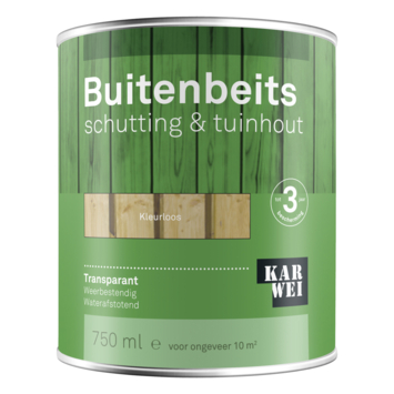 KARWEI buitenbeits schutting & tuinhout is een transparante beits op terpentinebasis. Voor een bescherming tot 3 jaar van schuttingen, speeltoestellen en tuinhout. KARWEI buitenbeits transparant dringt goed in het hout, beschermt tegen weersinvloeden zoals regen en zon, is vochtregulerend en maakt het hout waterafstotend. Ook zeer geschikt voor geïmpregneerd hout. Na het behandelen blijft de natuurlijke structuur en nerf van het hout goed zichtbaar.