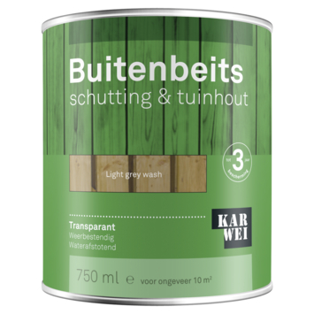 KARWEI buitenbeits schutting & tuinhout is een transparante beits op terpentinebasis. Voor een bescherming tot 3 jaar van schuttingen, speeltoestellen en tuinhout. KARWEI buitenbeits transparant dringt goed in het hout, beschermt tegen weersinvloeden zoals regen en zon, is vochtregulerend en maakt het hout waterafstotend. Ook zeer geschikt voor geïmpregneerd hout. Na het behandelen blijft de natuurlijke structuur en nerf van het hout goed zichtbaar.