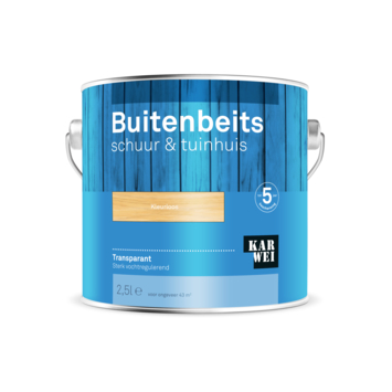KARWEI buitenbeits schuur & tuinhuis kleurloos 2,5 liter is een transparante beits op terpentinebasis. Voor een bescherming tot 5 jaar van bijvoorbeeld een schuur of tuinhuis. KARWEI buitenbeits transparant dringt goed in het hout en maakt het hout sterk vochtregulerend, weerbestendig en waterafstotend. Geschikt voor zowel onbehandeld als geïmpregneerd hout. Na het behandelen blijft de natuurlijke structuur en nerf van het hout goed zichtbaar.