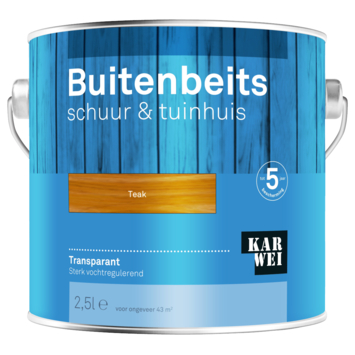 KARWEI buitenbeits schuur & tuinhuis teak 2,5 liter is een transparante beits op terpentinebasis. Voor een bescherming tot 5 jaar van bijvoorbeeld een schuur of tuinhuis. KARWEI buitenbeits transparant dringt goed in het hout en maakt het hout sterk vochtregulerend, weerbestendig en waterafstotend. Geschikt voor zowel onbehandeld als geïmpregneerd hout. Na het behandelen blijft de natuurlijke structuur en nerf van het hout goed zichtbaar.