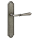 Deurkruk. Type Bento oud tin, op blind schild (zonder sleutelgat). De deurklink is vast gemonteerd op het schild en is voorzien van een veer waardoor de kruk niet gaat hangen. In de serie Bento zijn ook WC 63/8, blind schild en sleutelgat 56mm beschikbaar. Eveneens zijn er bijpassende cilinder -en sleutelplaatjes en wc garnituur te verkrijgen. Het is mogelijk om in de bouwmarkt afwijkende WC, sleutel en cilindermaten te bestellen.