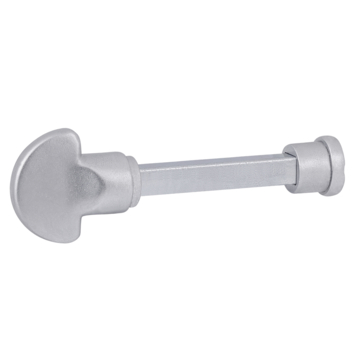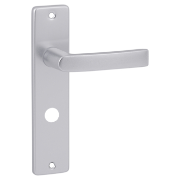 Deurkruk. Type Blok aluminium naturel, op kortschild voor wc, toilet of badkamer 63mm met stift 8mm. Deze deurklink is vast gemonteerd op het schild. Dus nooit meer de kruk los in je handen. In de serie Blok zijn blind schild en sleutelgat 56mm beschikbaar. Het is mogelijk om in de bouwmarkt afwijkende WC, sleutel en cilindermaten te bestellen.
