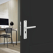 Deurkruk. Type Greece anox (mat aluminium), op langschild met sleutelgat 56mm. De deurklink is vast gemonteerd op het schild en is voorzien van een veer waardoor de kruk niet gaat hangen. In de serie Greece zijn ook de WC 63/8, blind schild en vierkant rozet beschikbaar. Het is mogelijk om in de bouwmarkt afwijkende WC, sleutel en cilindermaten te bestellen.