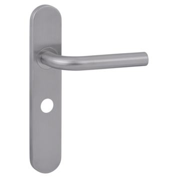 Deurkruk. Type Henry RVS kwaliteit geborsteld, op langschild voor wc, toilet of badkamer 63mm met stift 8mm. De deurklink is vast gemonteerd op het schild en is voorzien van een veer waardoor de kruk niet gaat hangen. De deurkrukset uit de Henry serie heeft een mooie, tijdloos design voor bijna ieder type inrichting. In de serie Henry zijn ook een blind schild, sleutelgat 56mm en een rond rozet beschikbaar. Het is mogelijk om in de bouwmarkt afwijkende WC, sleutel en cilindermaten te bestellen.