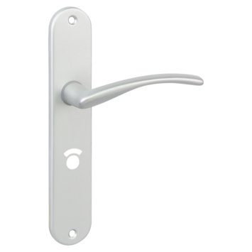 Deurkruk. Type Italië anox (mat aluminium), op langschild voor wc, toilet of badkamer 63mm met stift 8mm. De deurklink is vast gemonteerd op het schild en is voorzien van een veer waardoor de kruk niet gaat hangen. De stift van dit artikel is gemaakt van kunststof. In de serie Italië zijn ook een blind schild, sleutelgat 56mm en een rond rozet beschikbaar. Het is mogelijk om in de bouwmarkt afwijkende WC, sleutel en cilindermaten te bestellen.