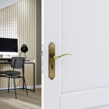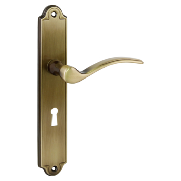 Deurkruk. Type Jorge brons, op langschild met sleutelgat 56mm. De deurklink is vast gemonteerd op het schild en is voorzien van een veer waardoor de kruk niet gaat hangen. In de serie Jorge zijn ook de WC 63/8, blind schild en rond rozet beschikbaar. Het is mogelijk om in de bouwmarkt afwijkende WC, sleutel en cilindermaten te bestellen.