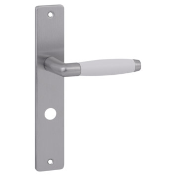 Deurkruk. Type Lago mat vernikkeld / wit, op langschild voor wc, toilet of badkamer 63mm met stift 8mm. De deurklink is vast gemonteerd op het schild en is voorzien van een veer waardoor de kruk niet gaat hangen. In de serie Lago zijn ook blind schild, sleutelgat 56mm en vierkant rozet beschikbaar. Het is mogelijk om in de bouwmarkt afwijkende WC, sleutel en cilindermaten te bestellen.