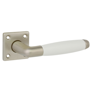 Deurkruk. Type Lago mat vernikkeld / wit, op vierkant rozet. De deurklink is vast gemonteerd op het rozet en is voorzien van een veer waardoor de kruk niet gaat hangen. In de serie Lago zijn ook blind schild, Wc 63/8 en sleutelgat 56mm beschikbaar. Eveneens zijn er bijpassende cilinder -en sleutelplaatjes en wc garnituur te verkrijgen. Het is mogelijk om in de bouwmarkt afwijkende WC, sleutel en cilindermaten te bestellen.