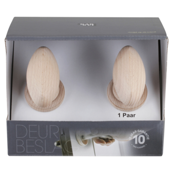 Deurkruk. Type Lilleham, hout naturel, op rond rozet. In de serie Lilleham zijn ook sleutelplaatjes beschikbaar