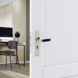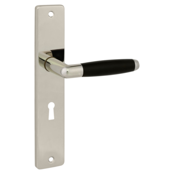 Deurkruk. Type Lopes glans vernikkeld / zwart, op langschild met sleutelgat 56mm. De deurklink is vast gemonteerd op het schild en is voorzien van een veer waardoor de kruk niet gaat hangen. In de serie Lopes zijn ook WC 63/8, blind schild en vierkant rozet beschikbaar. Het is mogelijk om in de bouwmarkt afwijkende WC, sleutel en cilindermaten te bestellen.