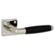 Deurkruk. Type Lopes glans vernikkeld / zwart, op vierkant rozet. De deurklink is vast gemonteerd op het rozet en is voorzien van een veer waardoor de kruk niet gaat hangen. In de serie Lopes zijn ook blind schild, sleutelgat 56mm en WC 63/8 beschikbaar. Eveneens zijn er bijpassende cilinder -en sleutelplaatjes en wc garnituur te verkrijgen. Het is mogelijk om in de bouwmarkt afwijkende WC, sleutel en cilindermaten te bestellen.
