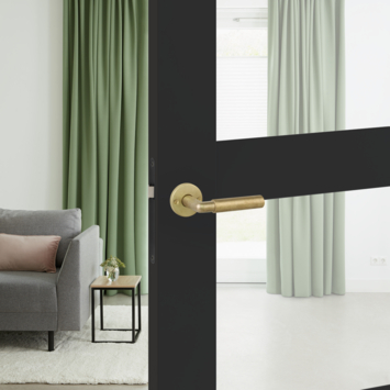 Deurkruk. Type Luca messing mat, op rond rozet. De deurklink is vast gemonteerd op het rozet en is voorzien van een veer waardoor de kruk niet gaat hangen. In de serie Luca zijn ook sleutel- en cilinderplaatje en WC garnituur beschikbaar.