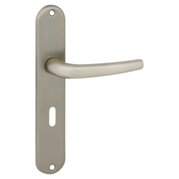 Deurkruk. Type Mario mat vernikkeld (RVS look), op langschild met sleutelgat 56mm. De deurklink is vast gemonteerd op het schild en is voorzien van een veer waardoor de kruk niet gaat hangen. In de serie Mario zijn ook de WC 63/8, blind schild en rond rozet beschikbaar. Het is mogelijk om in de bouwmarkt afwijkende WC, sleutel en cilindermaten te bestellen.