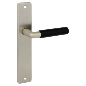 Deurkruk. Type Nelson glans vernikkeld / zwart, op langschild blind (zonder sleutelgat). De deurklink is vast gemonteerd op het schild en is voorzien van een veer waardoor de kruk niet gaat hangen. In de serie Neslon zijn ook de WC 63/8, sleutelgat 56mm en rond rozet beschikbaar. Het is mogelijk om in de bouwmarkt afwijkende WC, sleutel en cilindermaten te bestellen.