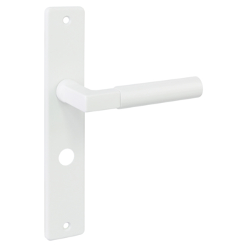 Deurkruk. Type Stefano aluminium wit op langschild voor wc, toilet of badkamer 63 mm met stift 8 mm. De deurklink is vast gemonteerd op het schild en is voorzien van een veer waardoor de kruk niet gaat hangen. In de serie Stefano zijn ook blind schild, sleutelgat 56 mm en vierkant rozet beschikbaar. Het is mogelijk om in de bouwmarkt afwijkende WC, sleutel en cilindermaten te bestellen.