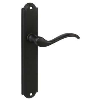 Deurkruk. Type Tiago oud bruin , op langschild blind (zonder sleutelgat). De deurklink is vast gemonteerd op het schild en is voorzien van een veer waardoor de kruk niet gaat hangen. In de Tiago zijn ook WC 63/8, sleutelgat 56mm en rond rozet beschikbaar. Geen afwijkende maten beschikbaar voor WC, sleutel en cilinder.